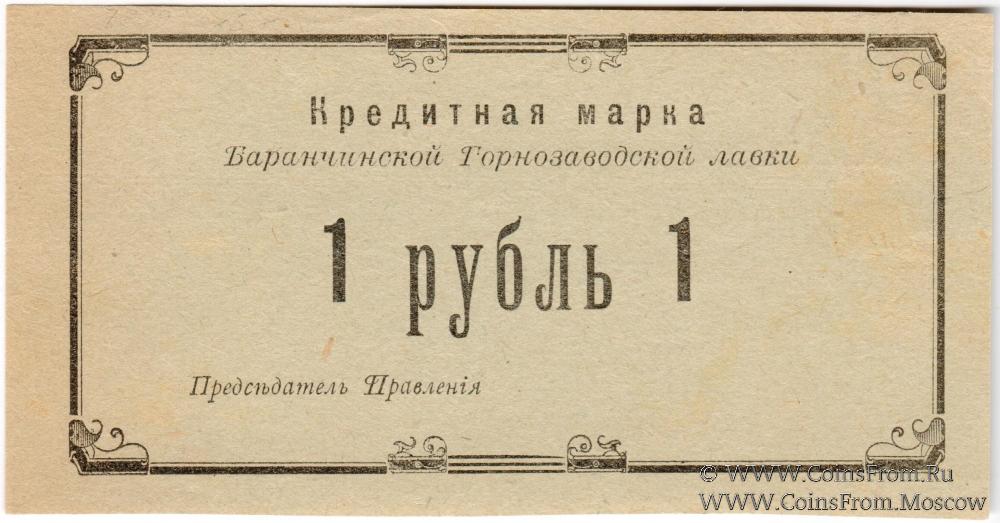 Кредитная марка 1919 г. Бежевый оттенок бумаги. Буква "У" в слове "рубль" длинная. Баранчинская Горнозаводская лавка.