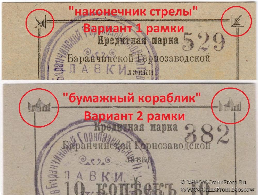 Кредитная марка 1919 г. С номером и оттиском печати. Вариант 1 рамки - "наконечник стрелы". Баранчинская Горнозаводская лавка.