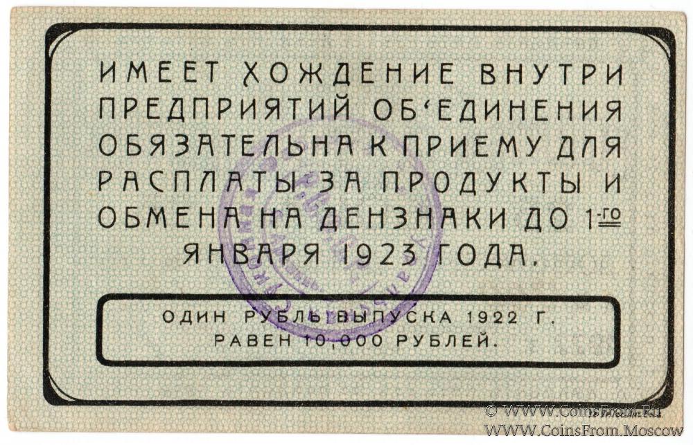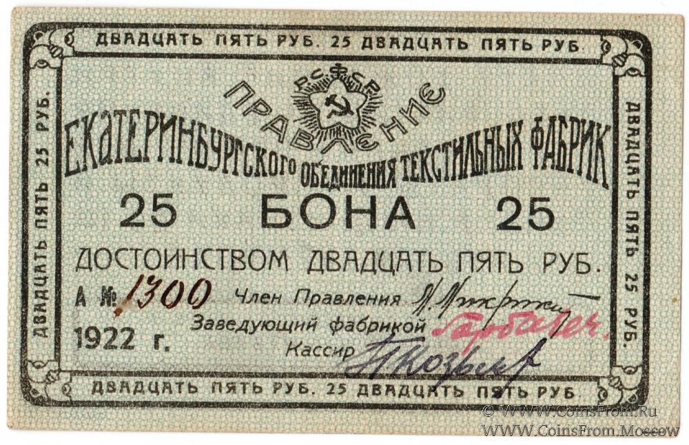 Печать круглая: "Р.С.Ф.С.Р." (по центру) "с. Арамиль" (по центру снизу полукругом) / "Уральская Суконная фабрика ***" (по кругу).