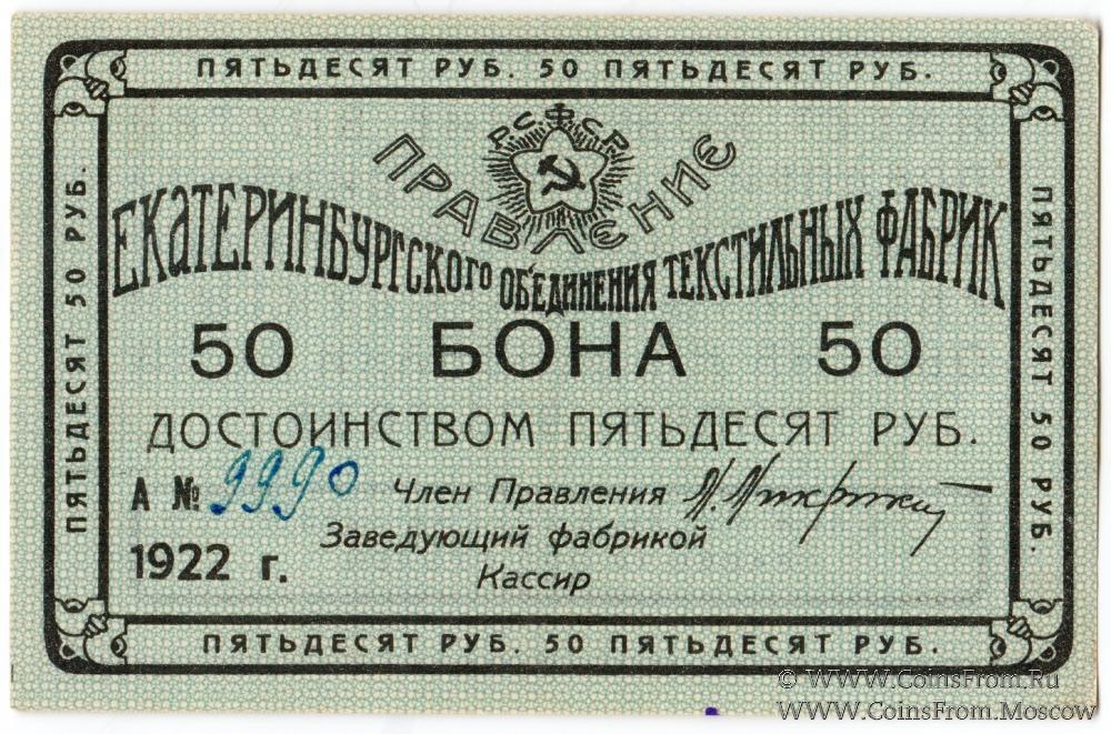 Бона 1922 г. Без подписей и печати. Правление Екатеринбургского объединения текстильных фабрик.