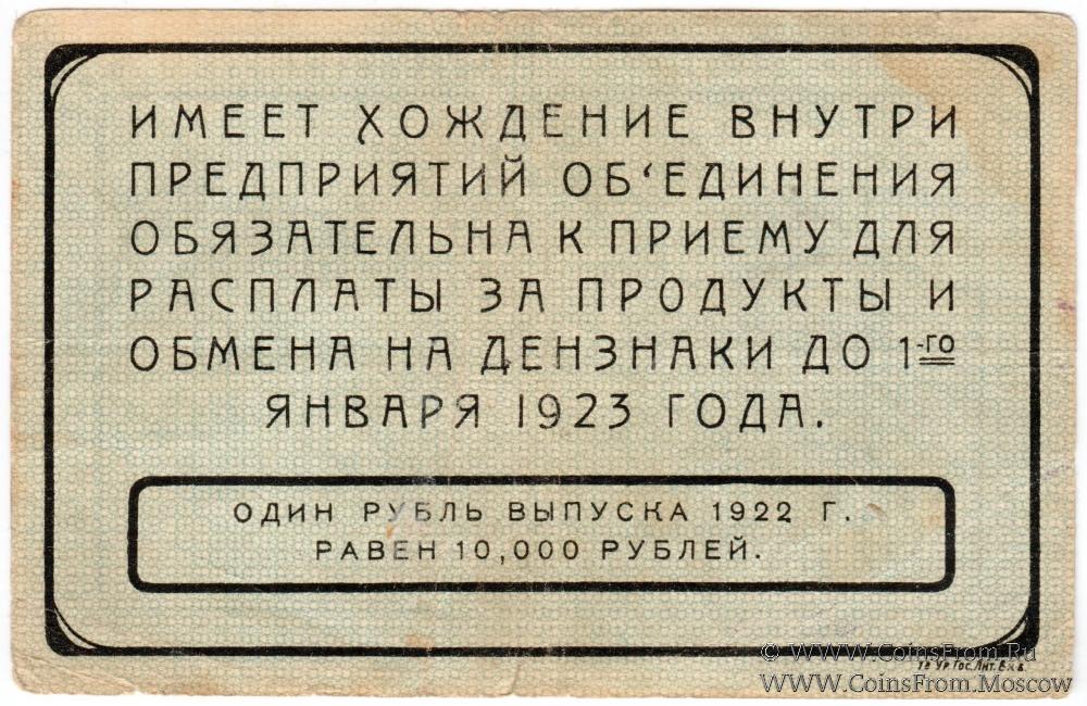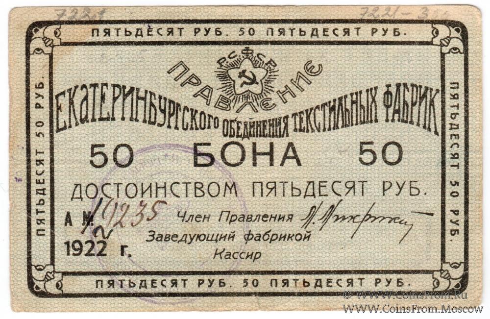 Бона 1922 г. Без подписей. Печать на аверсе (Екатеринбургская Льно-Прядильная ткацкая фабрика имени Ленина). Правление Екатеринбургского объединения текстильных фабрик.