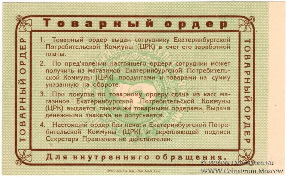 Товарный ордер (в валюте 1923 г.). Серия Б. С белым полем слева. Текст и рамка коричневые. Екатеринбургская Потребительская коммуна (Ц.Р.К.).