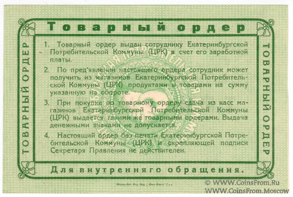 Товарный ордер (в валюте 1923 г.). Серия В. Бланк. Без номера. Текст и рамка зеленая. Екатеринбургская Потребительская коммуна (Ц.Р.К.).