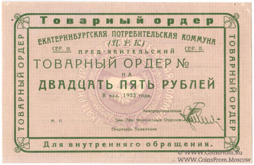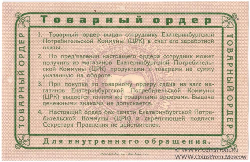 Товарный ордер (в валюте 1923 г.). Серия В. Текст и рамка зелёные. Екатеринбургская Потребительская коммуна (Ц.Р.К.).