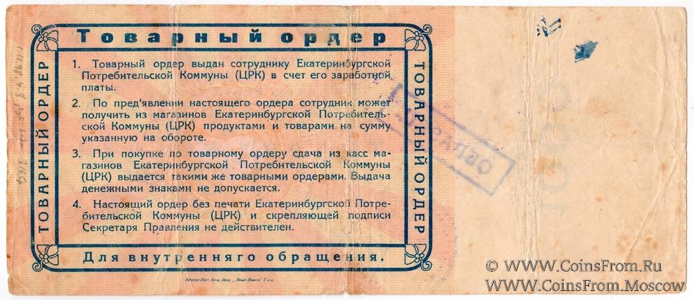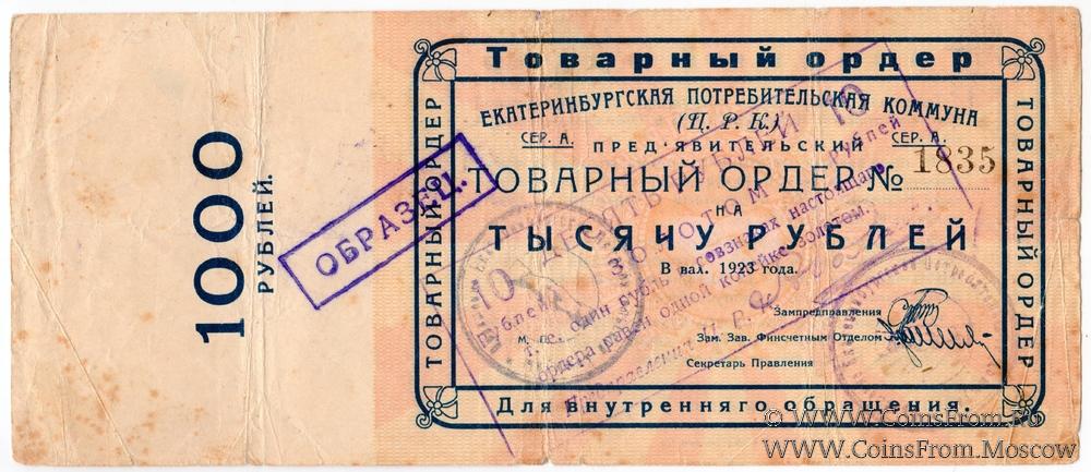 Товарный ордер 1923 г. (золотом). Штамп "ОБРАЗЕЦ" и штамп об изменении номинала на 1.000 руб. 1923 г. сер. А. Екатеринбургская Потребительская коммуна (Ц.Р.К.).