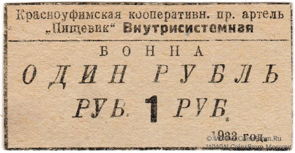 Внутрисистемная бонна 1933 г. Бумага бежевая. Бланк. Красноуфимская Кооперативно-промысловая артель "Пищевик".