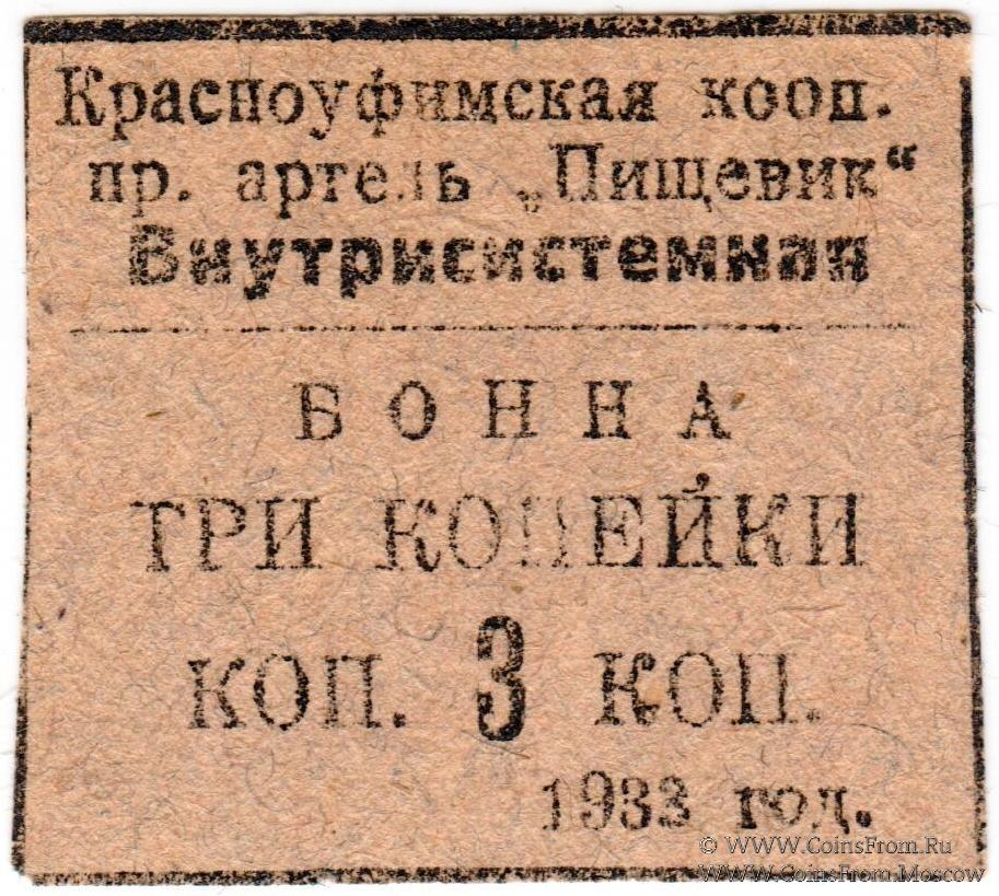 Внутрисистемная бонна 1933 г. Бумага бежевая. Бланк. Красноуфимская Кооперативно-промысловая артель "Пищевик".