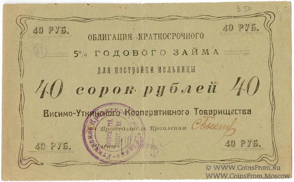 Печать круглая: "Висимо-Уткинское Кредитное Т-во *" (по кругу) / "Пермск. губ. / Верхот.уъз." (по центру, в две строки)