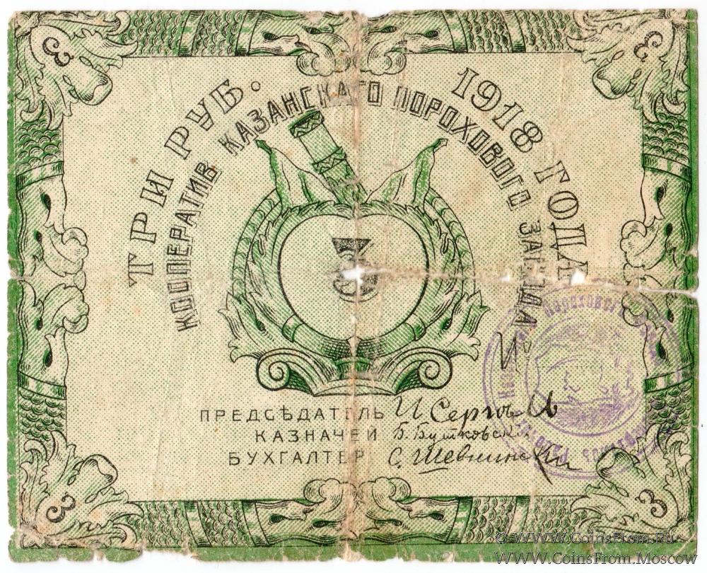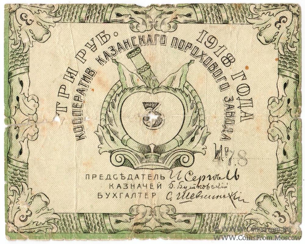 С печатью на аверсе. Номер на реверсе 3-значный типографский, расположен горизонтально. Кооператив Казанского Порохового Завода.