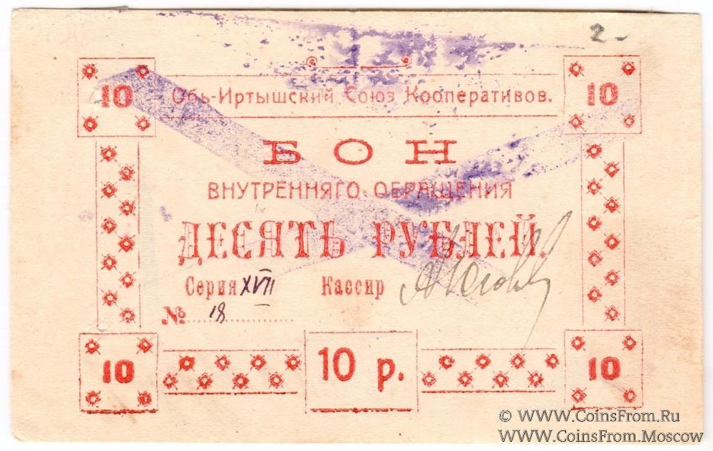 Бон. С оттиском штампа союза на реверсе и крестообразным гашением на аверсе. Обь-Иртышский Союз Кооперативов.