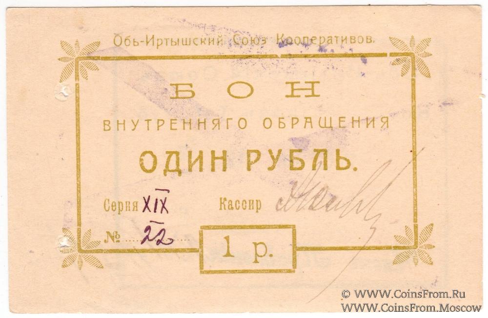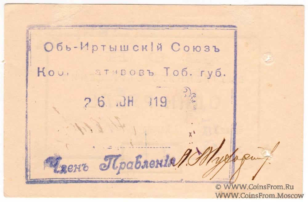 Бон. С оттиском штампа союза на реверсе и крестообразным гашением на аверсе. Обь-Иртышский Союз Кооперативов.