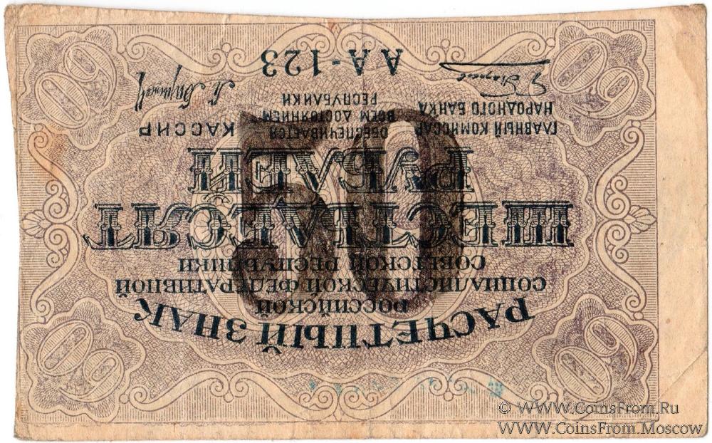 На 60 рублях 1919 г.: 2 печати и подписи на аверсе; надпечатка номинала "50" крупно - на реверсе.