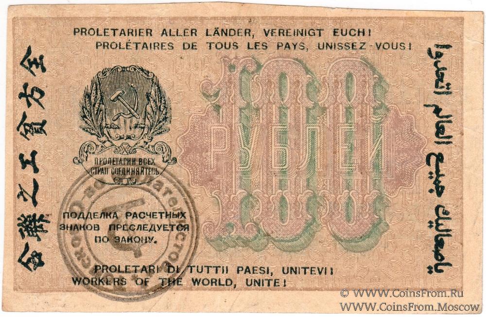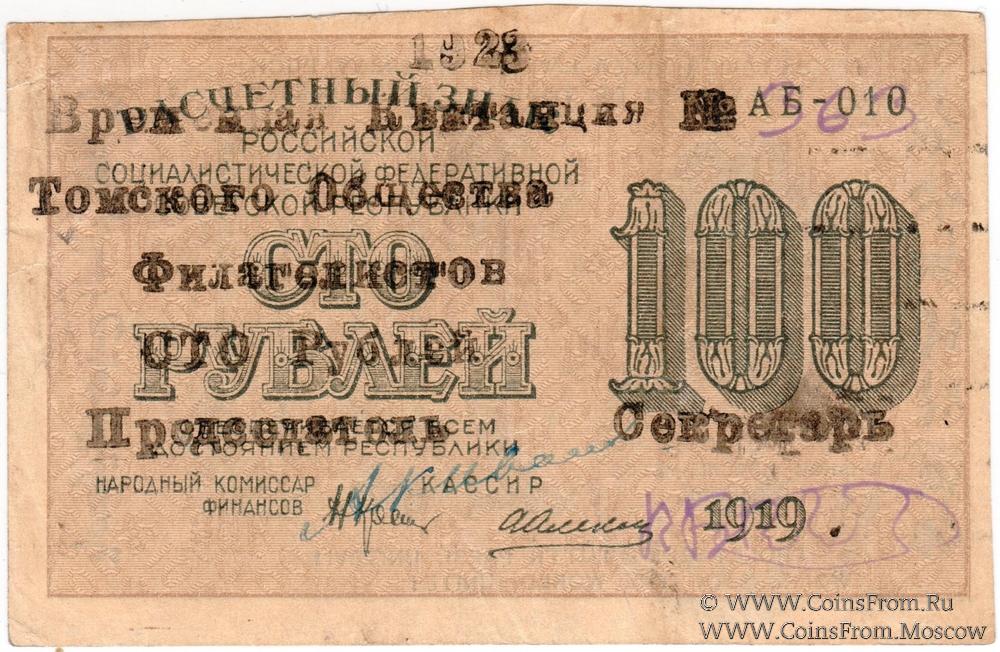 На 100 рублях 1919 г. : номер от руки, номинал прописью и подписи на аверсе; печать на реверсе.