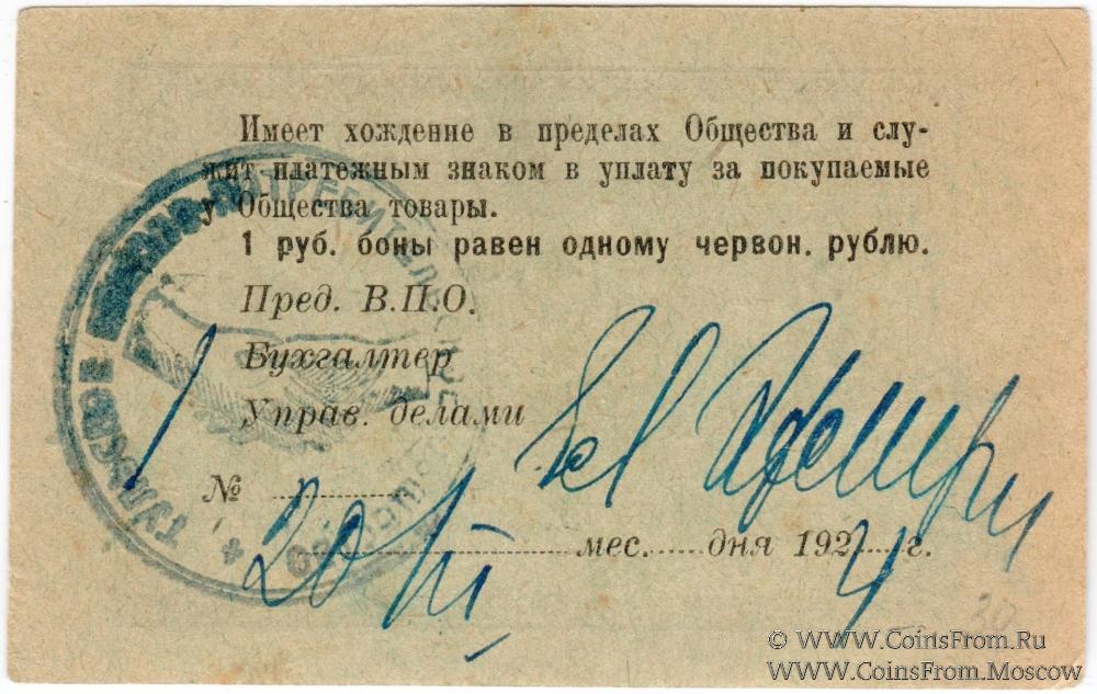 Бона. На реверсе: печать и подпись. Рамка со звездой. Тульское Военно-Потребительское Общество.