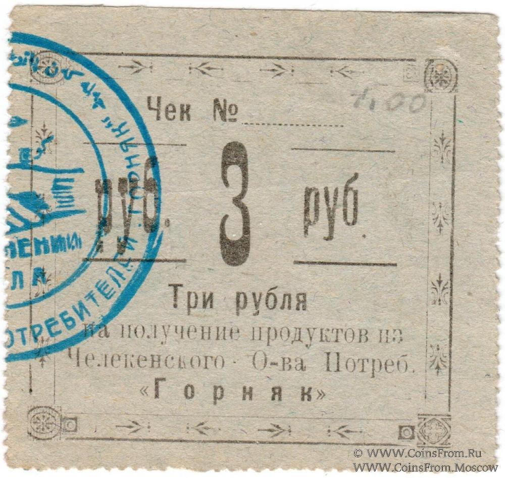 Чек без даты (1918 г.). Печать на аверсе. Рамка - "стрелки". Челекенское Потребительское общество "Горняк".