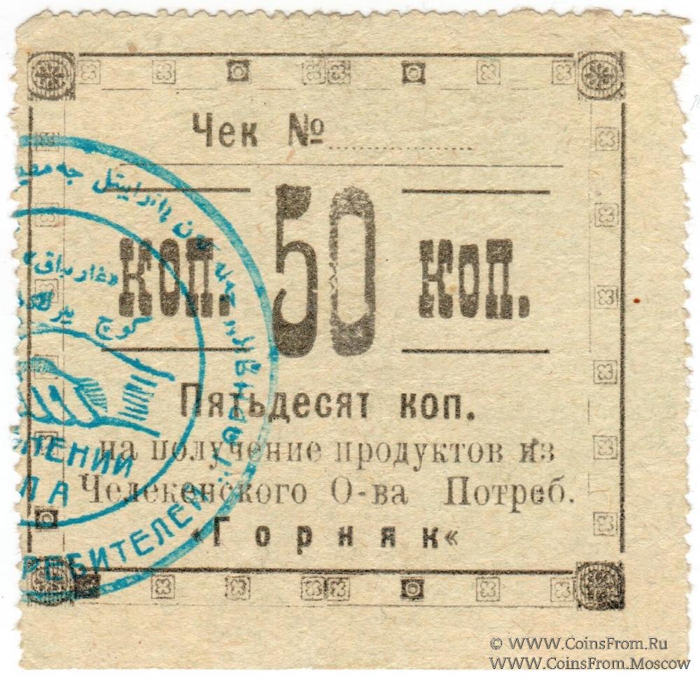Чек без даты (1918 г.). Печать на аверсе. Рамка - "квадраты". Челекенское Потребительское общество "Горняк".