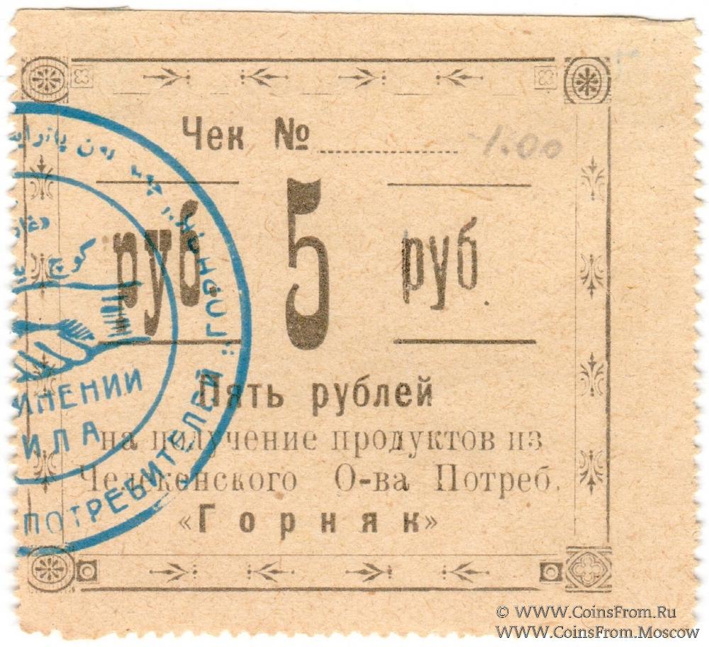 Чек без даты (1918 г.). Печать на аверсе. Рамка - "стрелки". Челекенское Потребительское общество "Горняк".