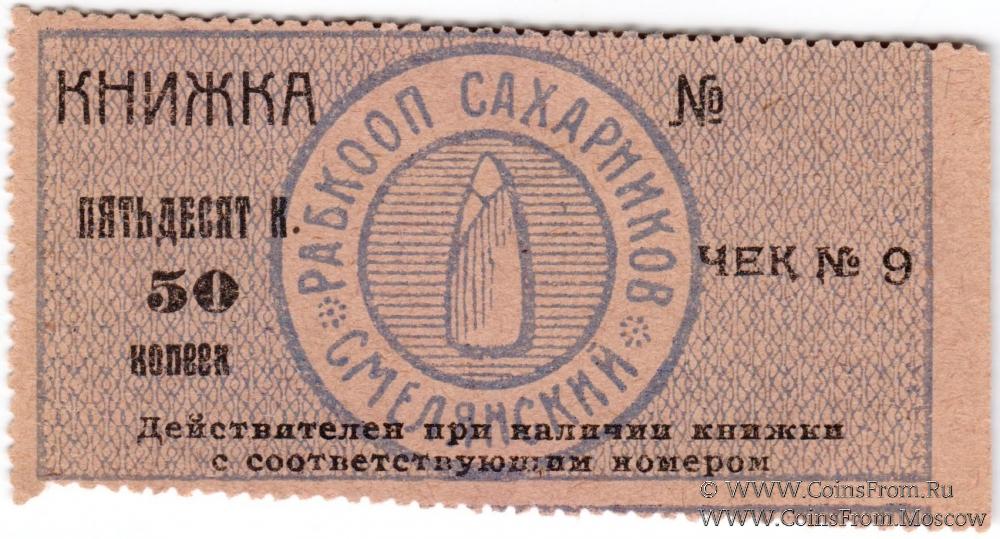 Без названия. Чек № 9. Без номера. БРАК обрезки: перфорация смещена. Рабочий кооператив сахарников Смелянский.