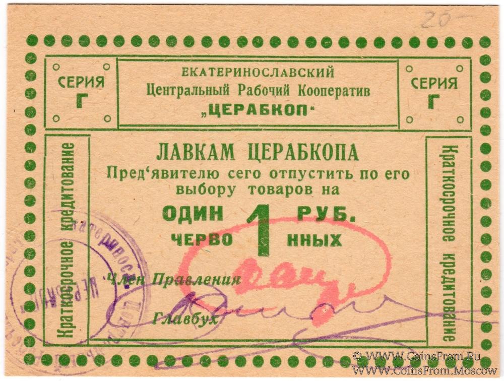 В червонных рублях. Серия Г. Подписи красная и фиолетовая. Екатеринославский Центральный Рабочий Кооператив "ЦЕРАБКОП".