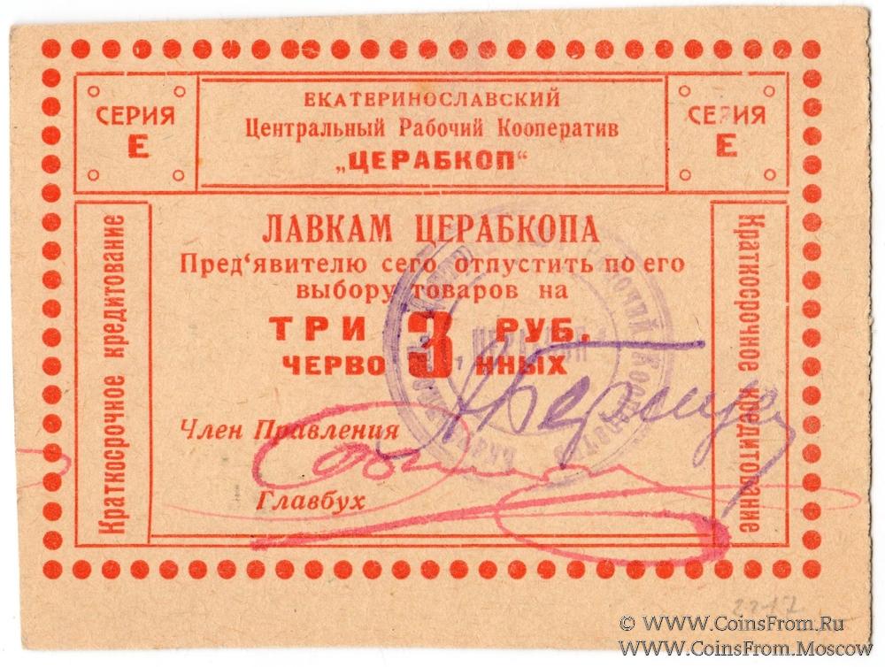 Главная > Магазин > Моя коллекция > Банкноты России периода Первой Мировой Войны, Гражданской войны, революции и первых лет Советской власти > Частные боны Гражданской войны > Украина > Днепропетровская область > Екатеринослав (Днепропетровск) > ЦЕРАБКОП > 3 рубля 1923 г. (Екатеринослав)