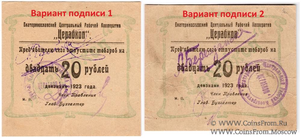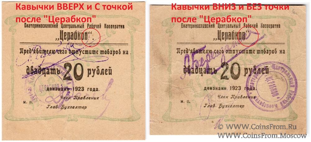 В денежных знаках 1923 г. Вариант подписи 1. Кавычки ВВЕРХ и С точкой после "Церабкоп". Екатеринославский Центральный Рабочий Кооператив "ЦЕРАБКОП".