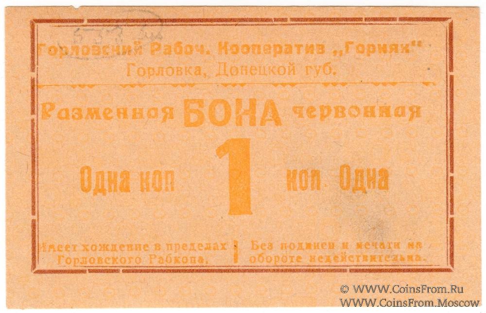 Разменная бона червонная без даты (1923 г.). Бланк. Горловский Рабочий Кооператив "Горняк".