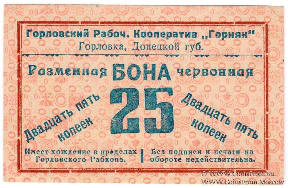 Разменная бона червонная без даты (1923 г.). Бланк. Горловский Рабочий Кооператив "Горняк".