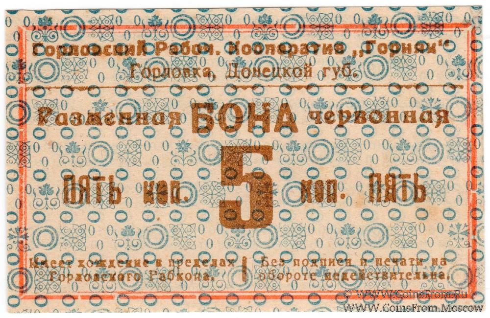 Разменная бона червонная без даты (1923 г.). Бланк. Бумага белая. Горловский Рабочий Кооператив "Горняк".