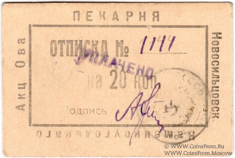 Отписка без даты (1920 г.). С оттиском штампа "Уплачено" и печатью. Пекарня Новосильцевского каменноугольного акционерного общества.