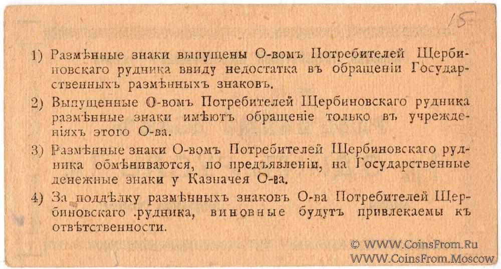 Разменный знак без даты (1918 г.). Общество потребителей Щербиновского рудника.