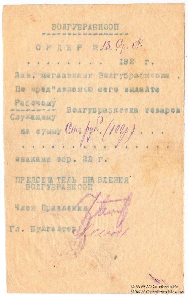 Ордер. Машинописный, голубая копирка. Со строкой для даты. Волынский губернский рабочий кооператив "Волгубрабкооп".
