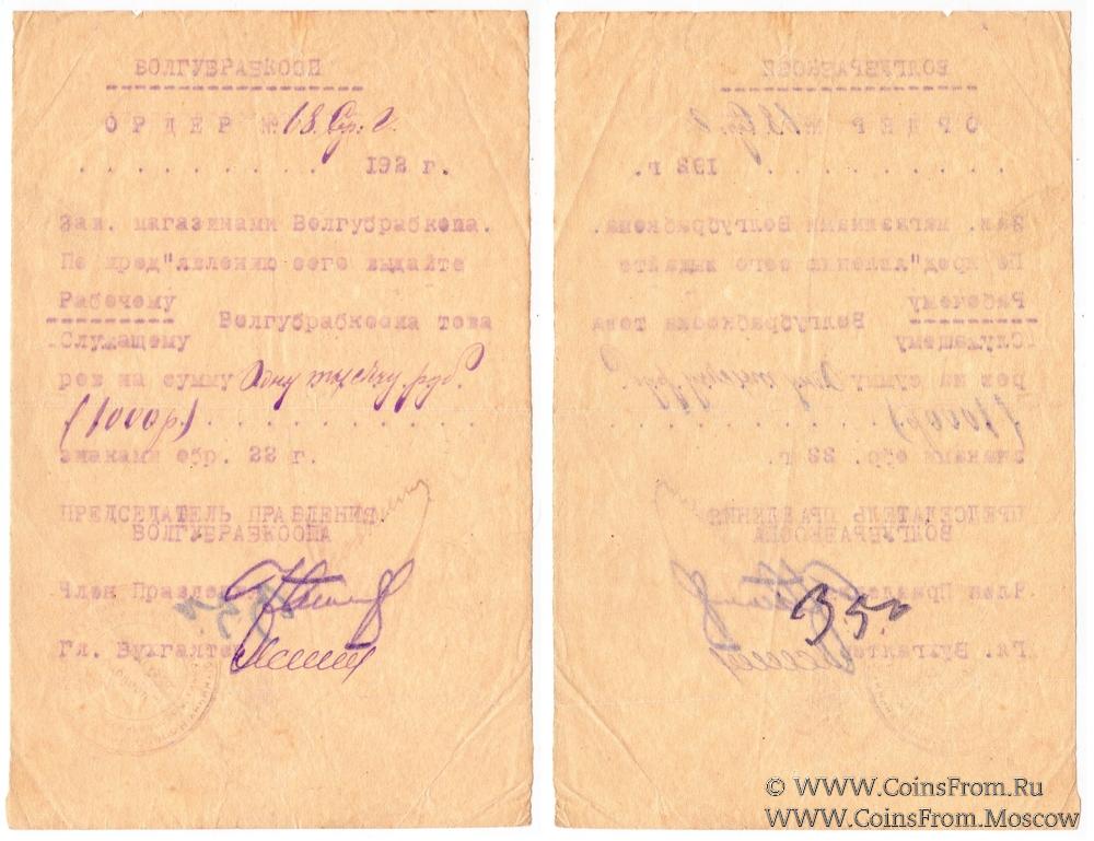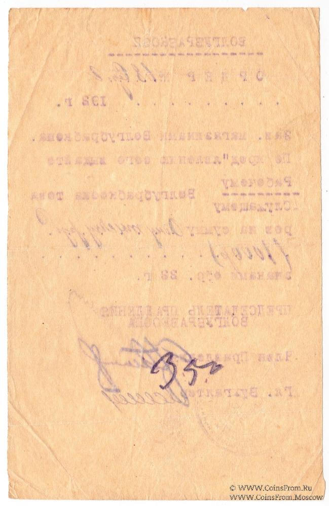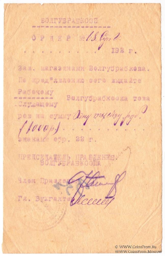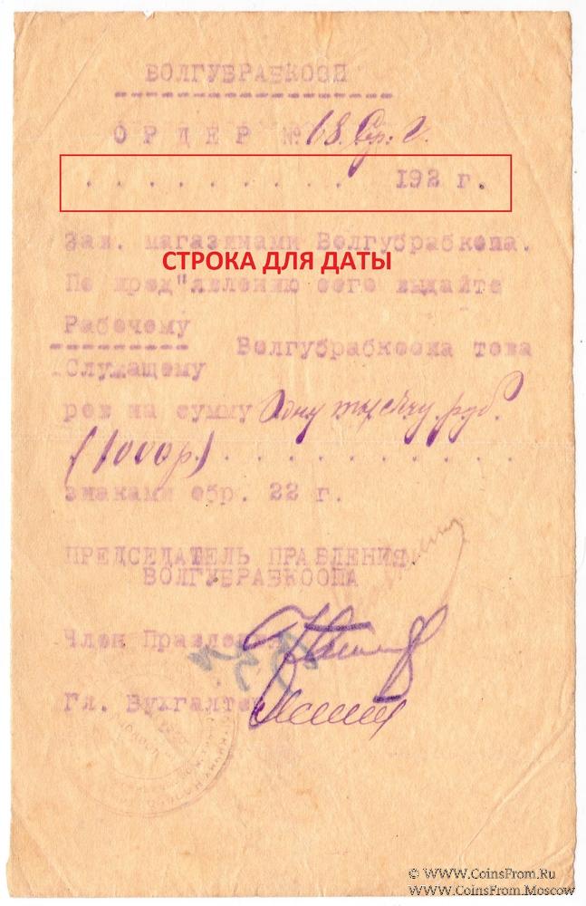 Ордер. Машинописный, фиолетовая копирка. Со строкой для даты. Волынский губернский рабочий кооператив "Волгубрабкооп".