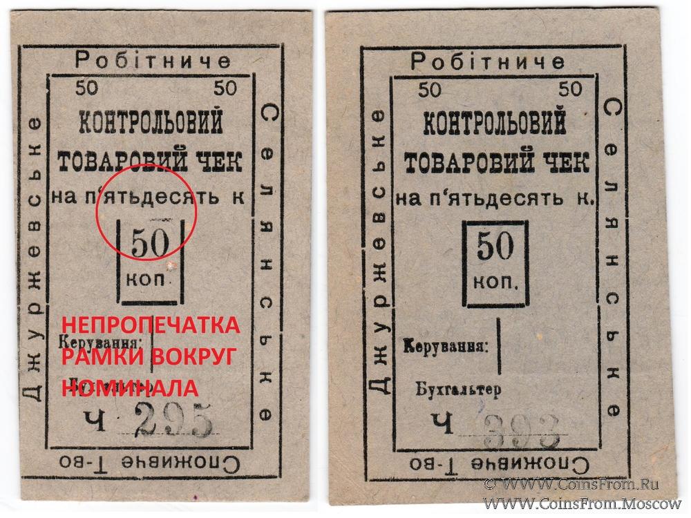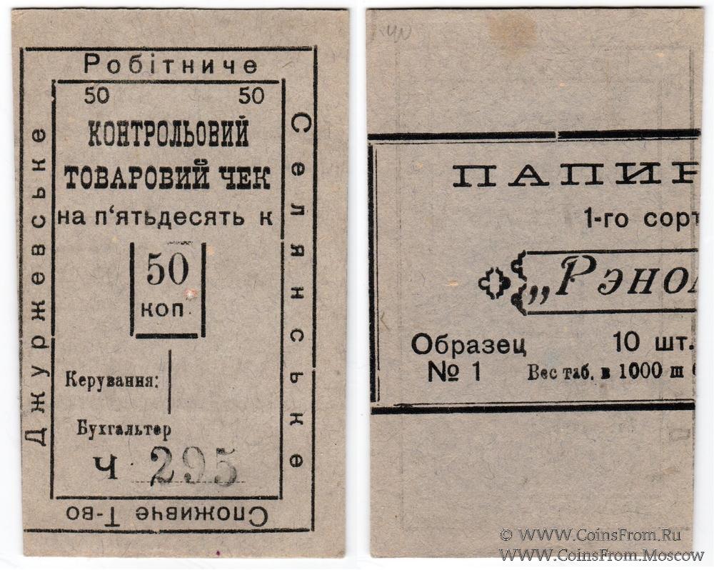 Контрольный товарный чек (Контрольовий товаровий чек) без даты. Бланк. БРАК: непропечатка рамки вокруг номинала. Вторичное использование: вариант 1 (Папиросы 1-го сорта "Рэномэ"). Джуржевское Рабоче-Крестьянское Потребительское Общество (Джуржевське Робітниче Селянське Споживче Товариство).
