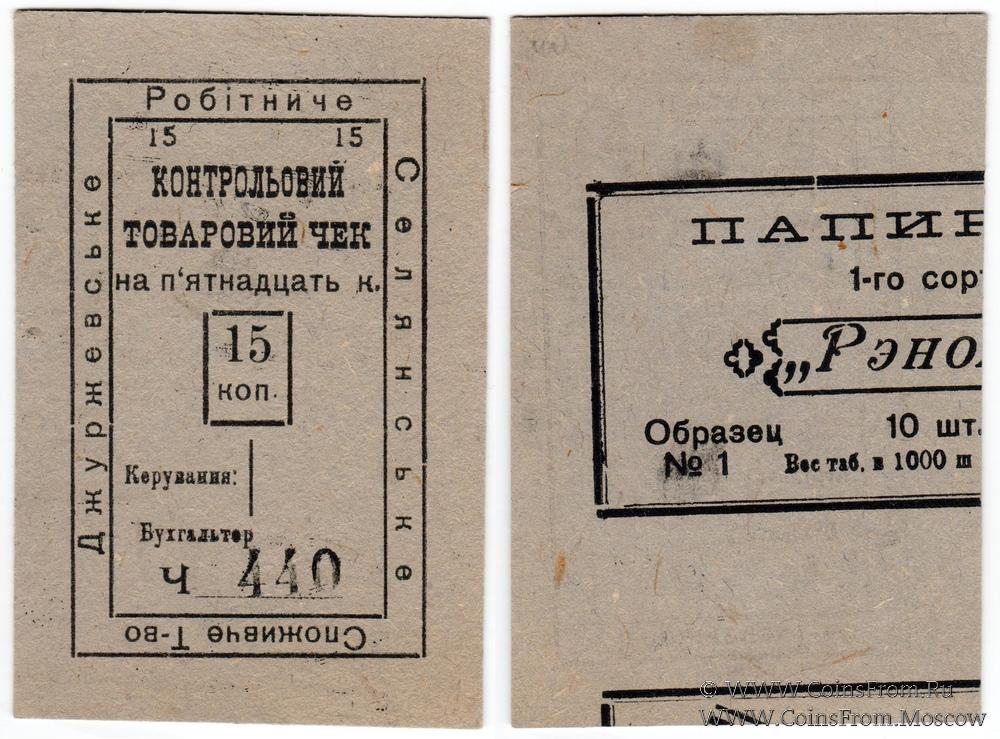Контрольный товарный чек (Контрольовий товаровий чек) без даты. Бланк. Вторичное использование: вариант 1 (Папиросы 1-го сорта "Рэномэ"). Джуржевское Рабоче-Крестьянское Потребительское Общество (Джуржевське Робітниче Селянське Споживче Товариство).