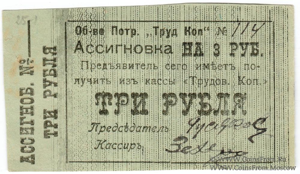 Ассигновка без даты. БРАК: в тексте с опечаткой "АССИГНОБ". Потребительское Общество "Трудовая копейка".