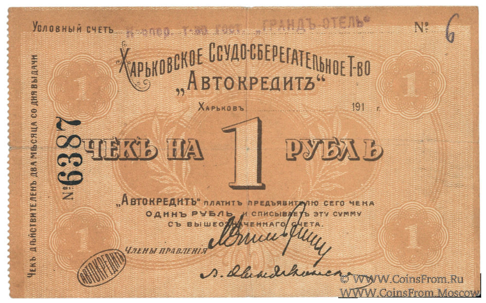 Условный счет № 6 Кооперативного товарищества гостиницы "ГРАНДЪ-ОТЕЛЬ".