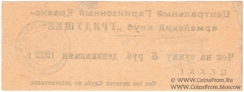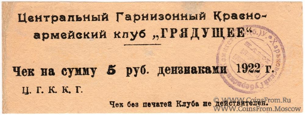 Чек дензнаками 1922 г. На аверсе круглая печать. Бумага серо-желтая. Центральный Гарнизонный Красноармейский клуб "ГРЯДУЩЕЕ".