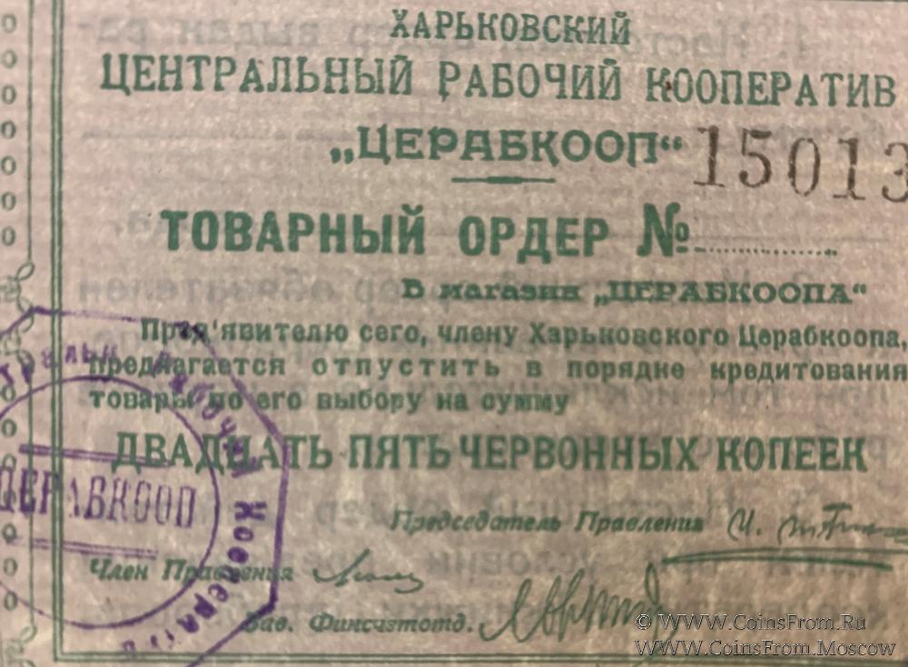 Товарный ордер без даты (1923 г.) в червонном исчислении. Элементы водяного знака. Харьковский Центральный Рабочий Кооператив "ЦЕРАБКООП".