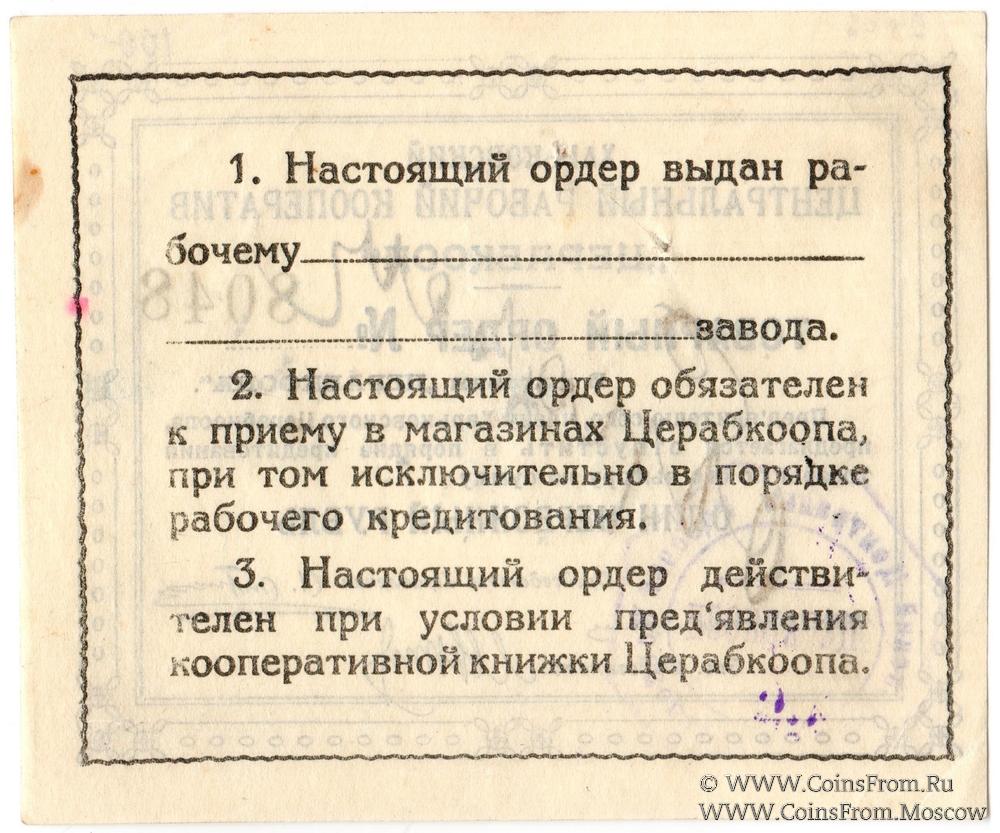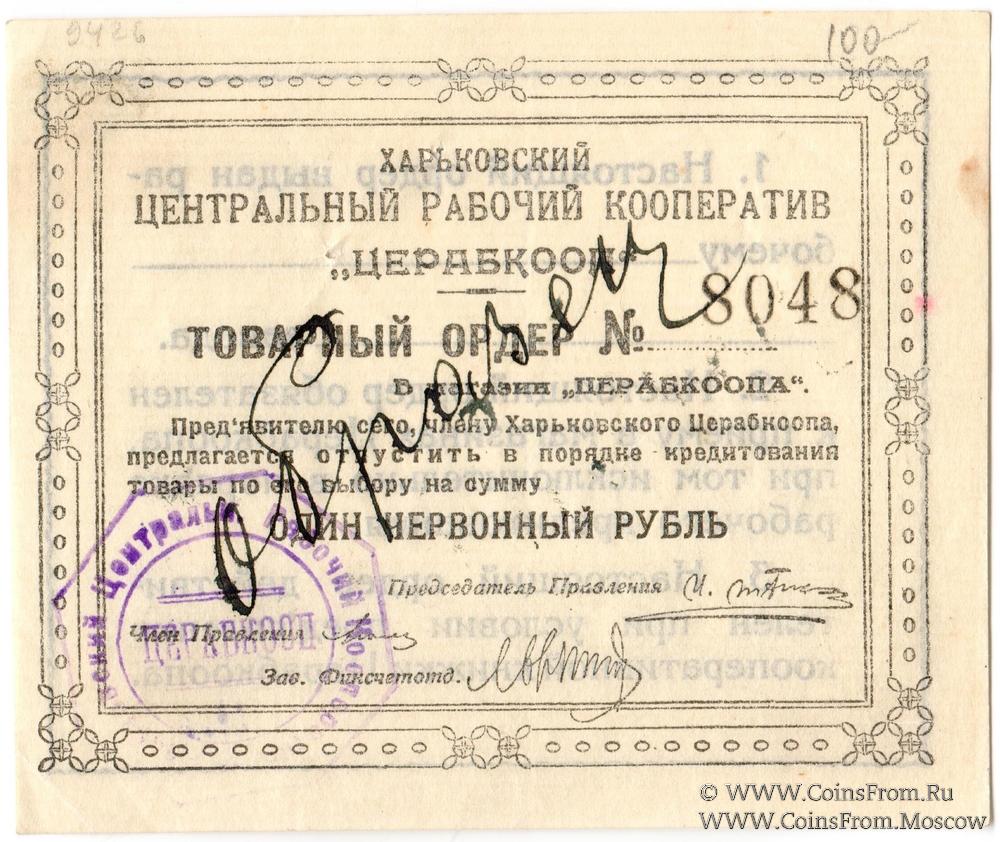 Товарный ордер без даты (1923 г.) в червонном исчислении. Надпись на аверсе от руки "Образец". Харьковский Центральный Рабочий Кооператив "ЦЕРАБКООП".