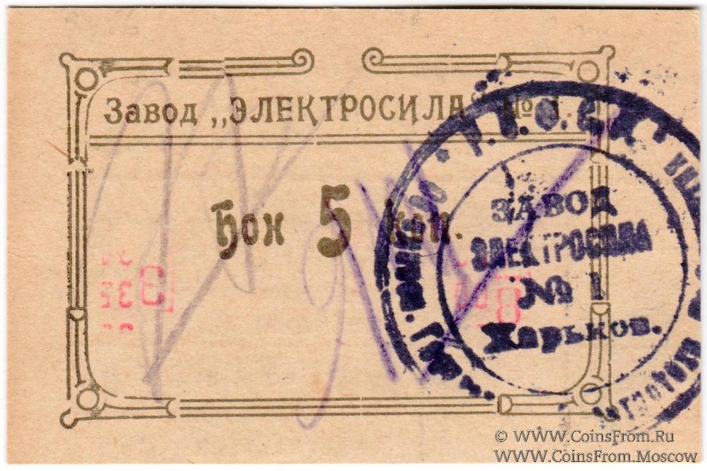 Печать круглая: "ЗАВОД ЭЛЕКТРОСИЛА № 1 Харьков" (по центру, в 4 строки) / "Об`единен. Государств. Электрохн. Предприятий *Р.С.Ф.С.Р.* " (по кругу).