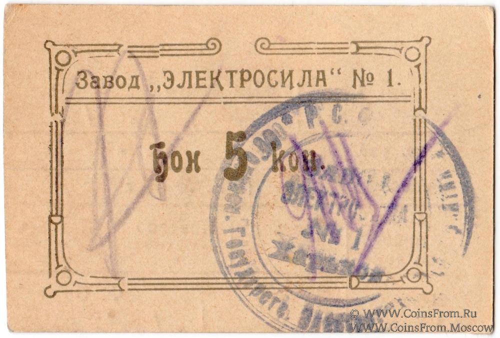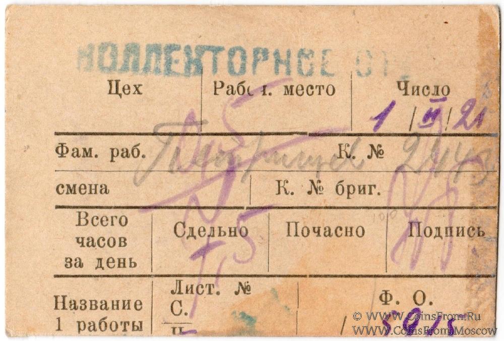 Бон без даты (1922 г.). На реверсе штамп "КОЛЛЕКТОРНОЕ ОТД". Подпись сиреневая. Завод "Электросила" №1.