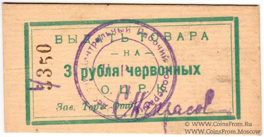 Главная > Магазин > Моя коллекция > Банкноты России периода Первой Мировой Войны, Гражданской войны, революции и первых лет Советской власти > Частные боны Гражданской войны > Украина > Одесская область > Одесса. Губернский город. > Одесский ЦРК > 3 рубля 1923 г. (Одесса)