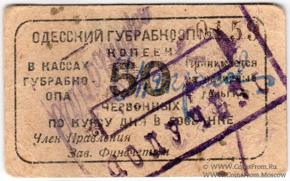 На аверсе: номер напечатан, прямоугольный штамп Одесского потребительского общества (О.П.О.) "ПОЛУЧЕНО". На реверсе 1 вариант печати (Правление).