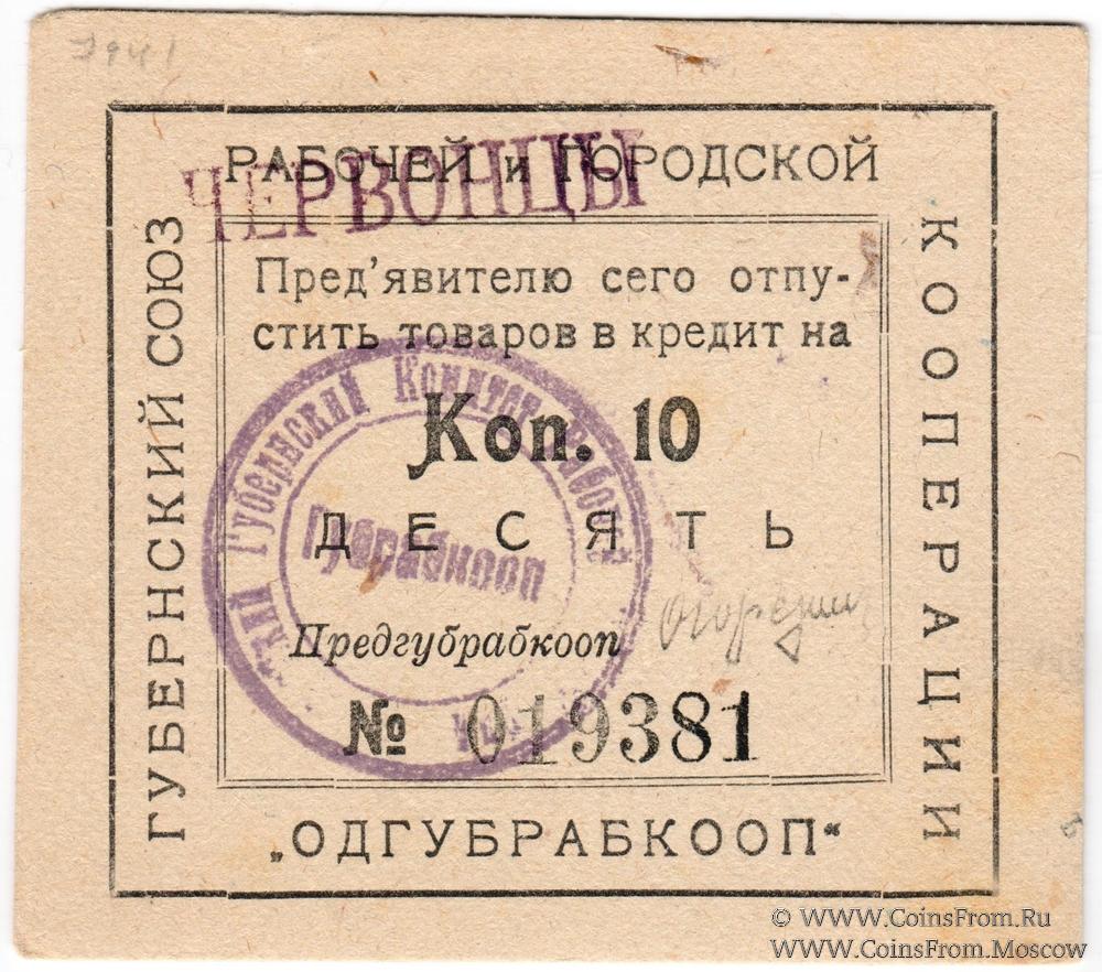 Печать "Губрабкооп" и надпечатка "ЧЕРВОНЦЫ" на аверсе. Одесский Губернский Союз Рабочей и Городской Кооперации "ОДГУБРАБКООП"