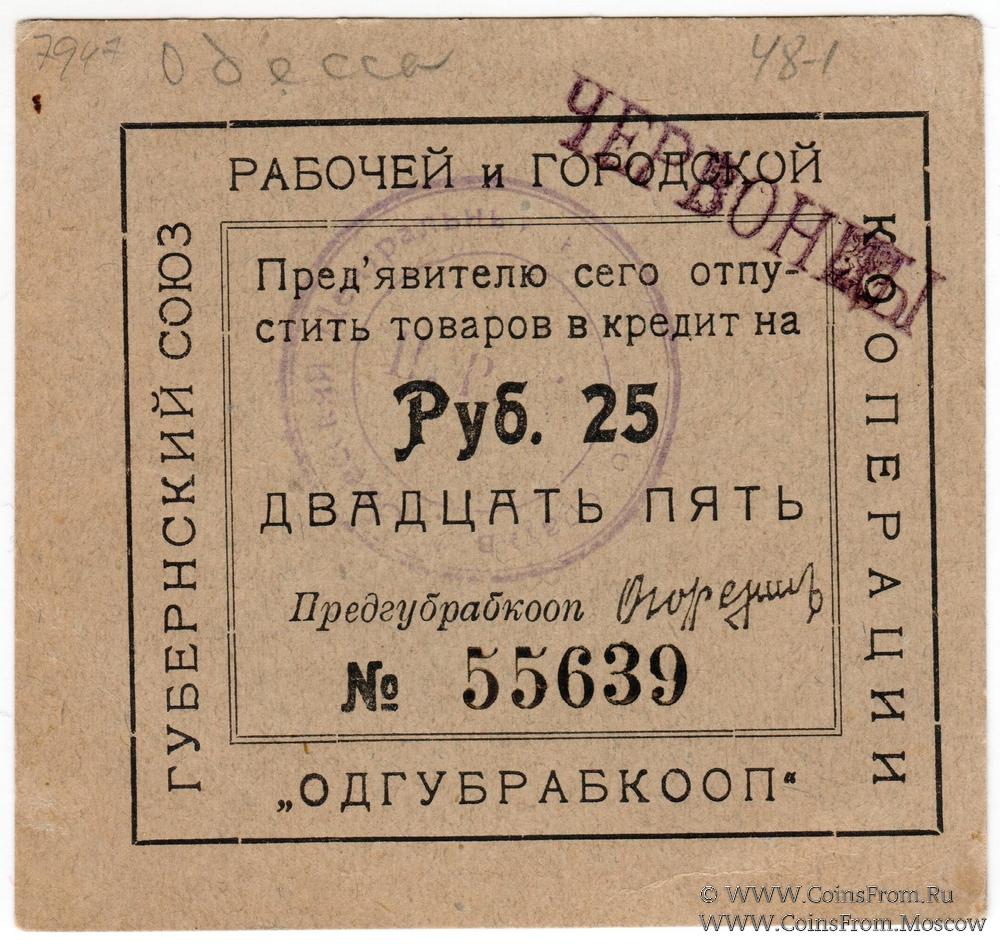 Печать "Одесский Ц.Р.К." и надпечатка "ЧЕРВОНЦЫ" на аверсе. Одесский Губернский Союз Рабочей и Городской Кооперации "ОДГУБРАБКООП"