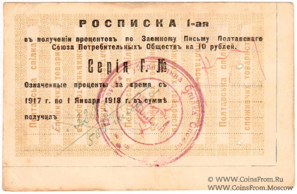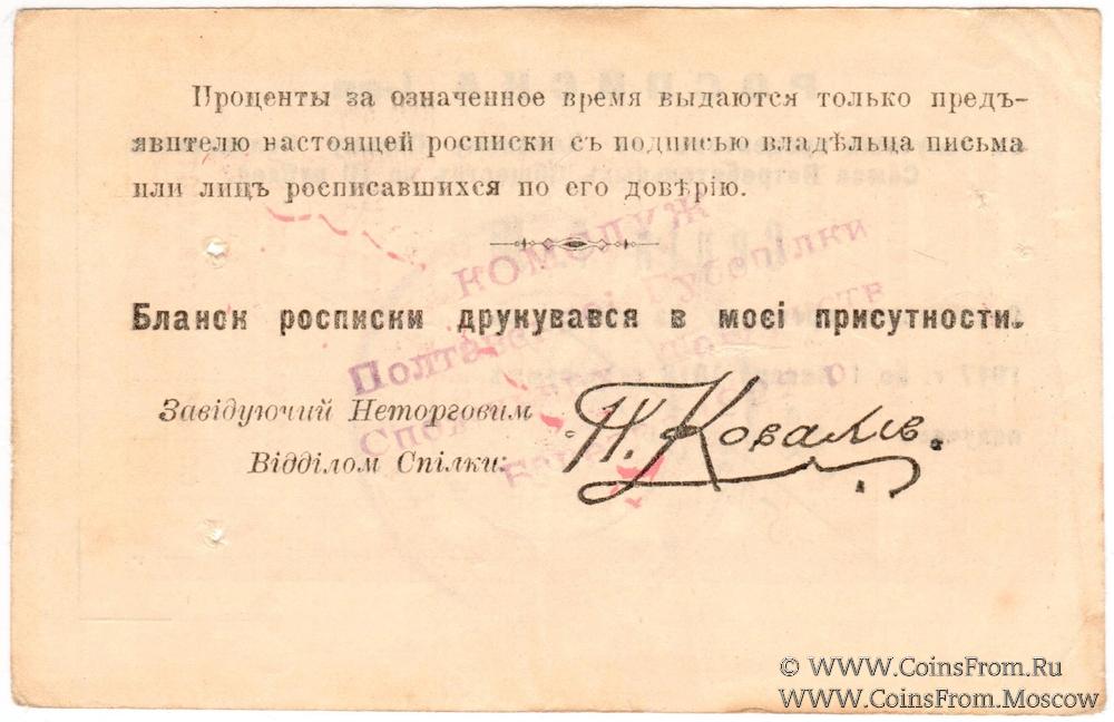 1-ая Расписка (Росписка) 1917 (1922) г. Серия Г. На аверсе номер и сумма прописью (500.000) от руки, печать и подпись красные. На реверсе штамп 1922 г., текст чёрный. Полтавский Союз Потребительских Обществ (Полтавська спiлка споживчих товариств).