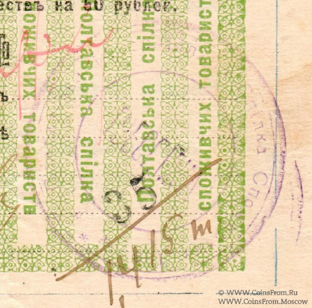 1-ая Расписка (Росписка) 1917 (1922) г. Серия Б. На аверсе номер штампом, сумма прописью (1.415.000) от руки, печать фиолетовая, подпись красная. На реверсе штамп 1922 г., текст синий. Полтавский Союз Потребительских Обществ (Полтавська спiлка споживчих товариств).