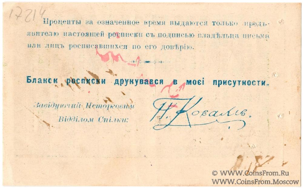 2-ая Расписка (Росписка) 1918 г. Серия Б. На аверсе номер и сумма (1.415) от руки, печать фиолетовая, подпись чёрная. На реверсе текст синий. Полтавский Союз Потребительских Обществ (Полтавська спiлка споживчих товариств).
