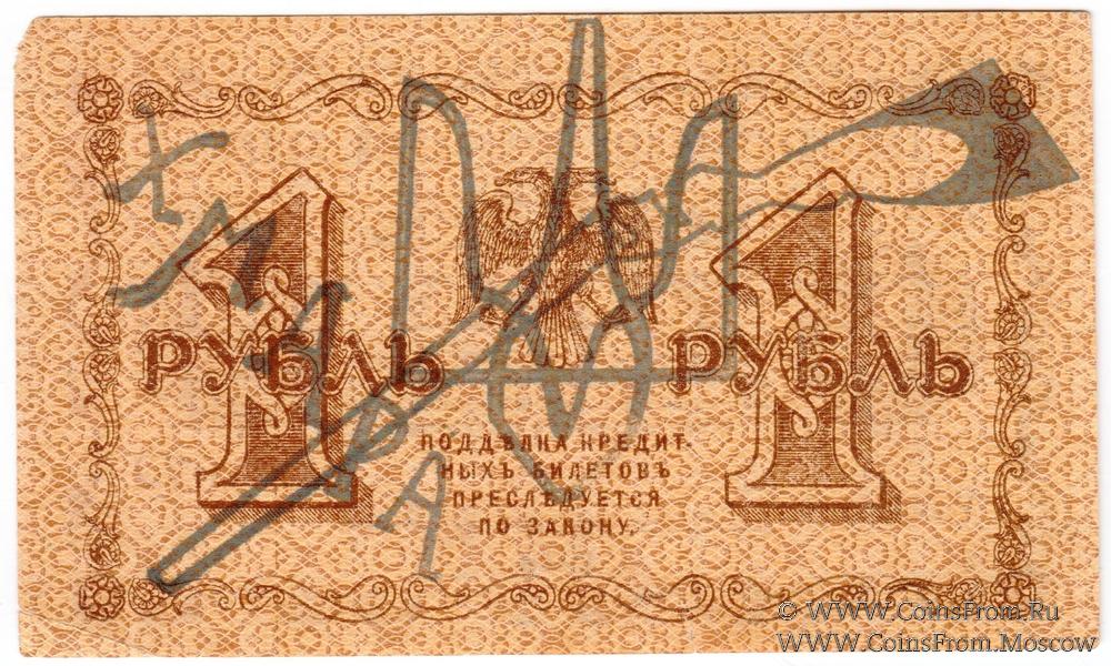Надпечатка петлюровского атамана Хмара черного цвета (большая) на реверсе государственного кредитного билета 1 рубль 1918 г. ("пятаковка").