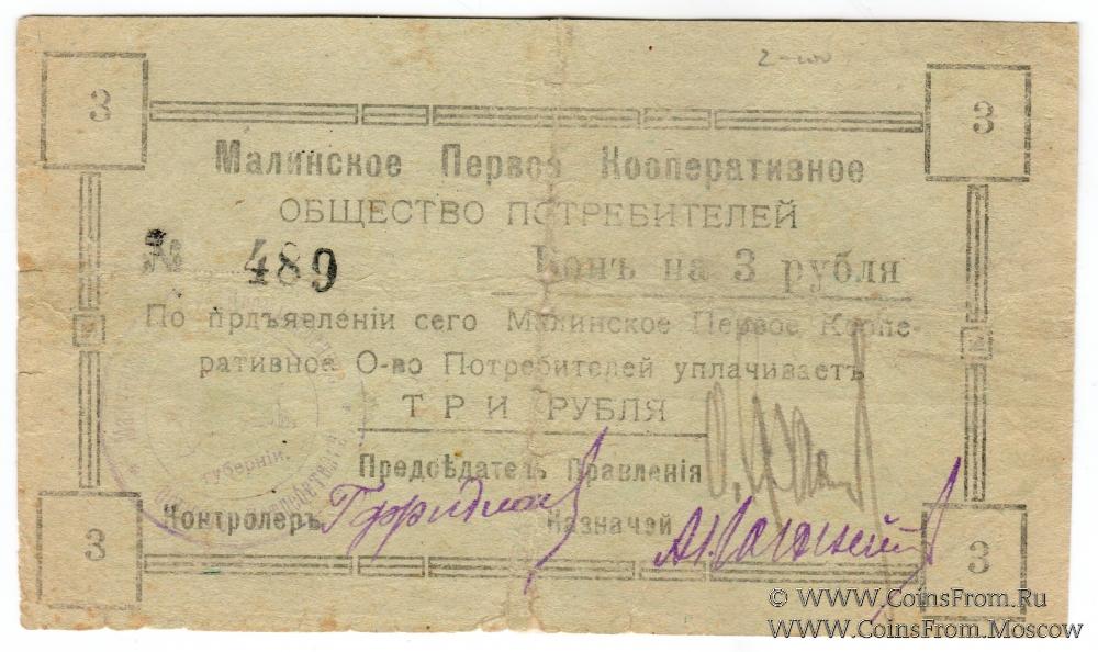 Бон без даты (1919 г.). Малинское Первое Кооперативное Общество Потребителей.